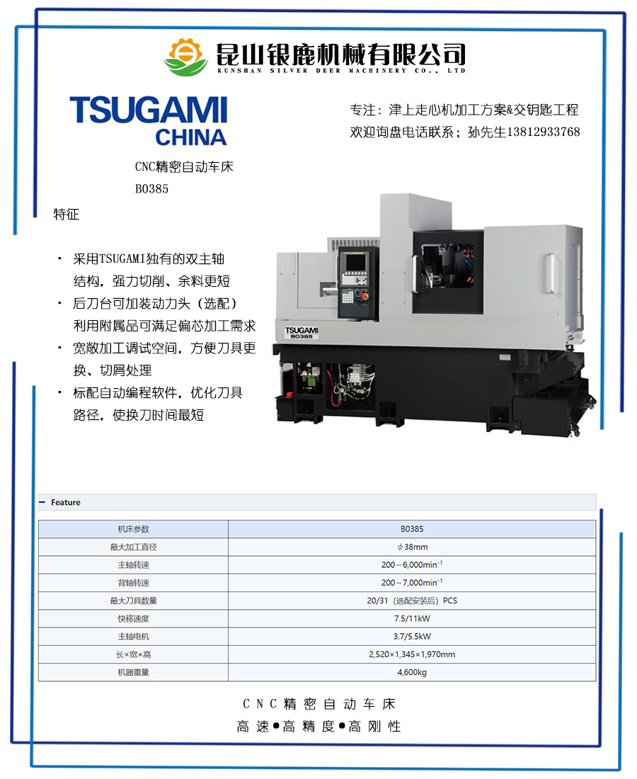 津上今朝在產最大直徑之走心機,合用直徑8-38mm,主軸7.5-11KW機電,背軸3.7/5.5KW,配套剛性高。對長軸類大直徑產物完成主動化批量加工。機床全體重達4600kg;比擬專業細節的局部,面談。